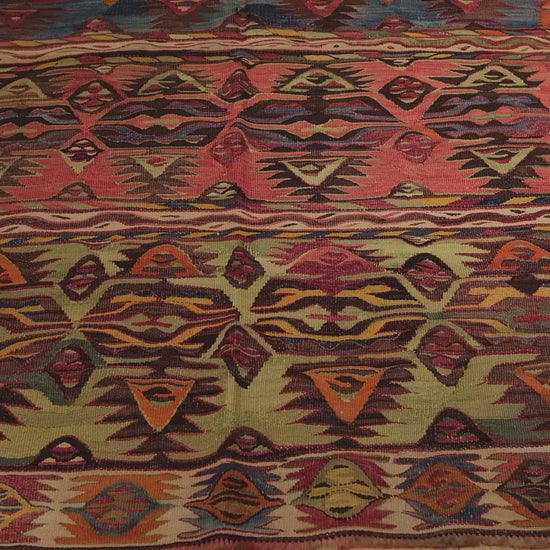 このアンティークキリムは、ホタムシュ村で手織りされたもので、サイズは約130cm x 310cmです。中央に配置された大きな菱形のメダリオンが特徴で、その内部や周囲には幾何学的なモチーフが織り込まれています。色彩は、深みのある赤や青、緑が主体で、天然染料による鮮やかな発色が魅力です。縁取りには細かなジグザグ模様が施され、全体のデザインに動きを与えています。このキリムは、ホタムシュ地方の伝統的なデザインと色彩を忠実に再現しており、歴史的価値の高い一品です。