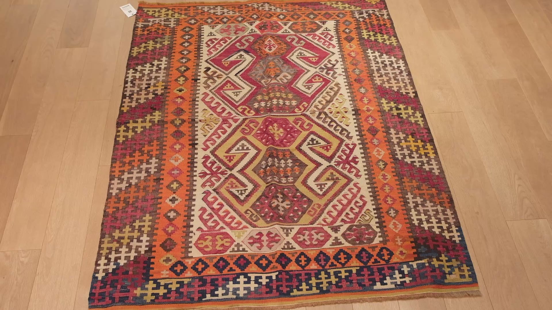 このコンヤ産アンティークキリム(品番:K28135)は、トルコ中央部のコンヤ地方で手織りされた希少な作品です。サイズは約140cm x 103cmで、素材は高品質なウール100%が使用されています。