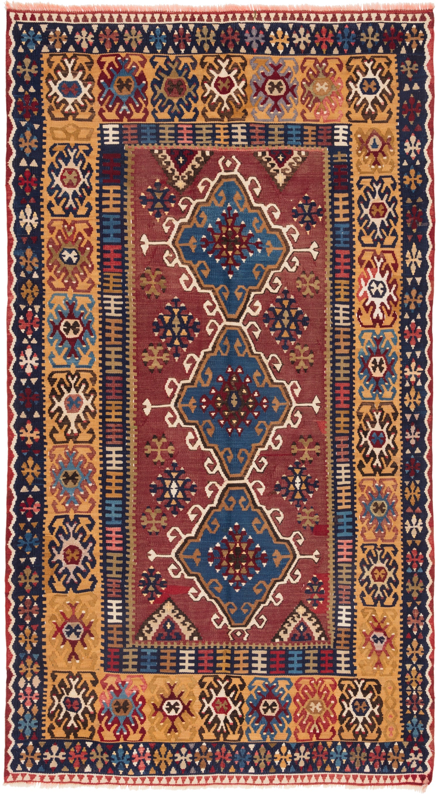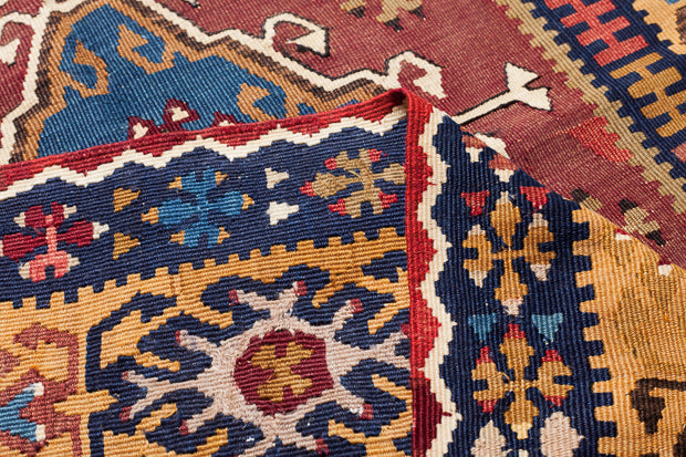 デザインと特徴: ヤフヤリ地方のキリムは、鮮やかな色彩と幾何学模様が特徴です。このキリムは、深い赤や青、緑などの色調が巧みに組み合わされ、中央には大きな菱形のメダリオンが配置されています。周囲を囲む複雑なパターンは、地域の伝統的なデザインを反映しています。