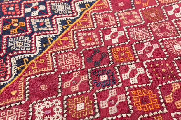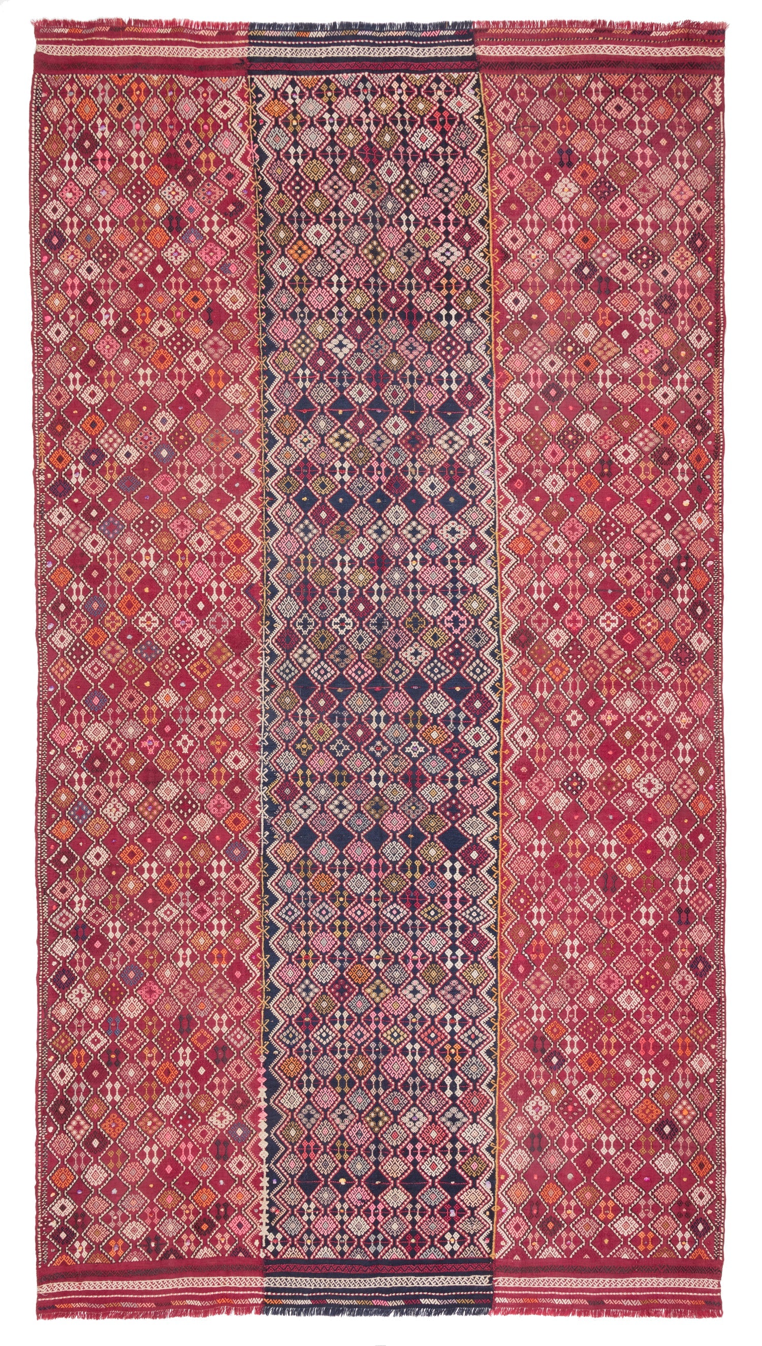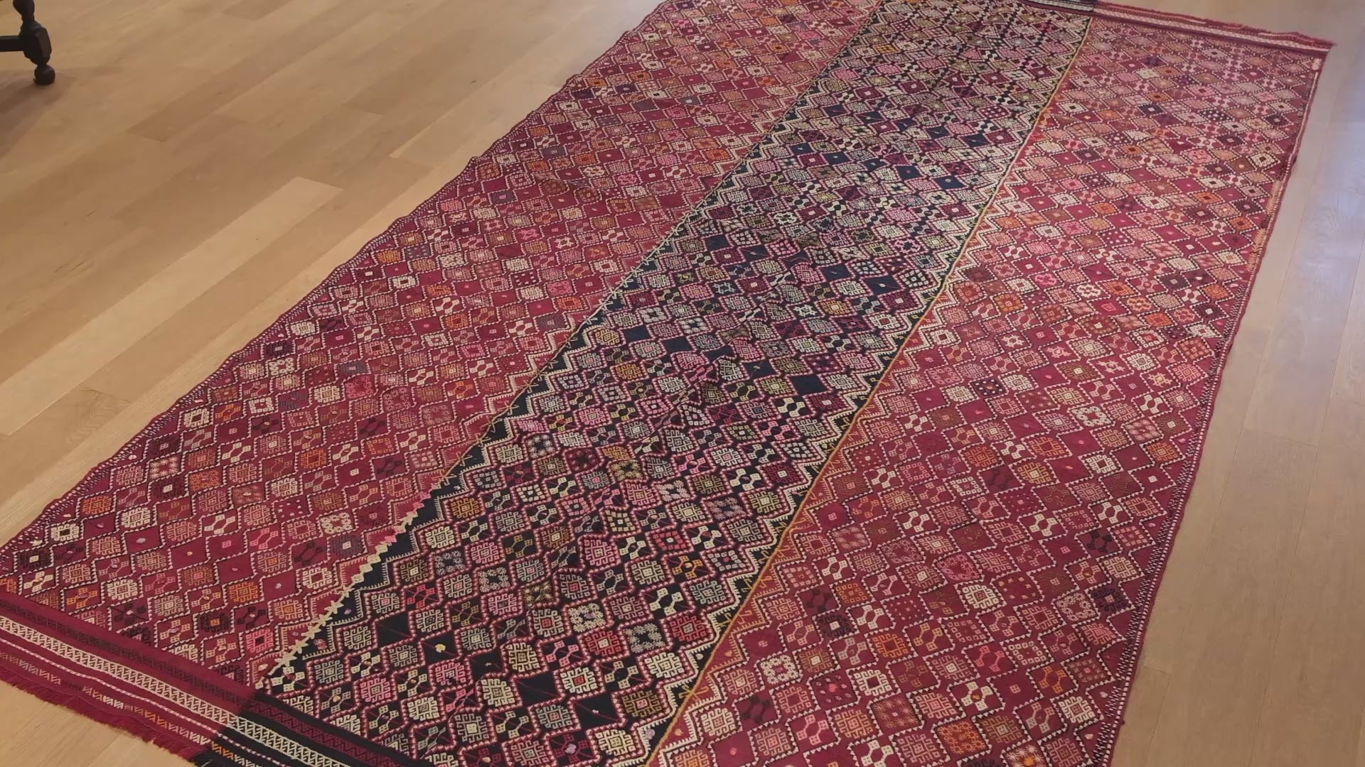デザインと特徴: シヴァス地方で手織りされたこのキリムは、伝統的な幾何学模様と鮮やかな色彩が特徴です。深い赤や青、緑などの色調が巧みに組み合わされ、中央には大きな菱形のメダリオンが配置されています。周囲を囲む複雑なパターンは、地域の伝統的なデザインを反映しています。