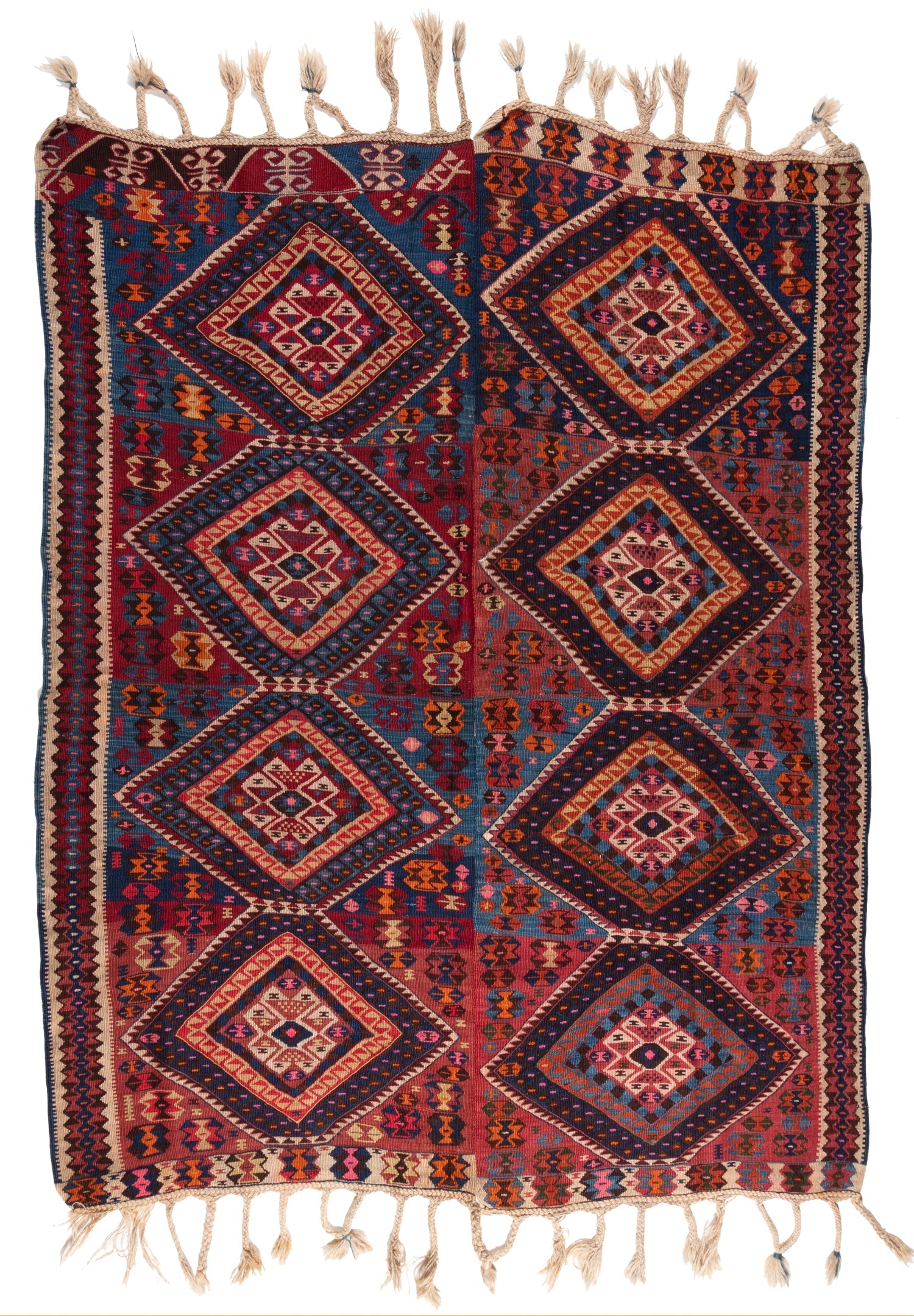 デザインと特徴: ヴァン地方のキリムは、深みのある色合いと独特の幾何学模様が特徴です。このキリムは、深い赤や青、緑などの色調が巧みに組み合わされ、中央には大きな菱形のメダリオンが配置されています。周囲を囲む複雑なパターンは、地域の伝統的なデザインを反映しています。