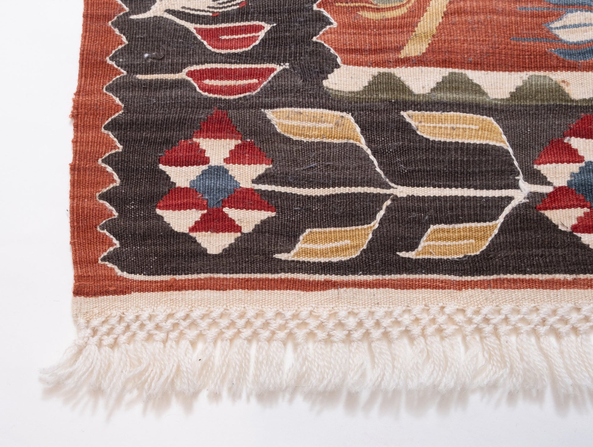 素材と技法: 高品質なウールを使用し、熟練の職人による手織りで丁寧に仕上げられています。平織りと手結びの技法が組み合わされ、独特の質感と耐久性を持っています。