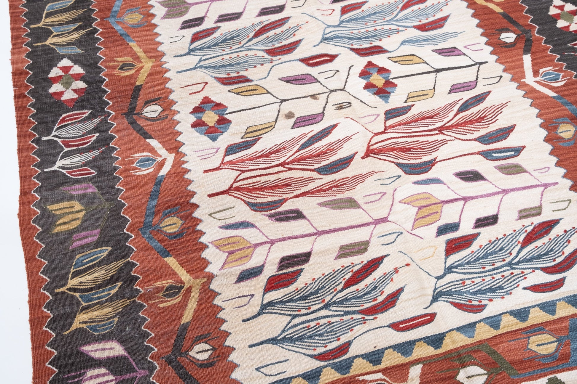 このコンヤ ニューキリム(品番:K50059)は、トルコのコンヤ地方で手織りされた平織りのキリムです。サイズは175cm x 120cmで、素材はウール100%が使用されています。