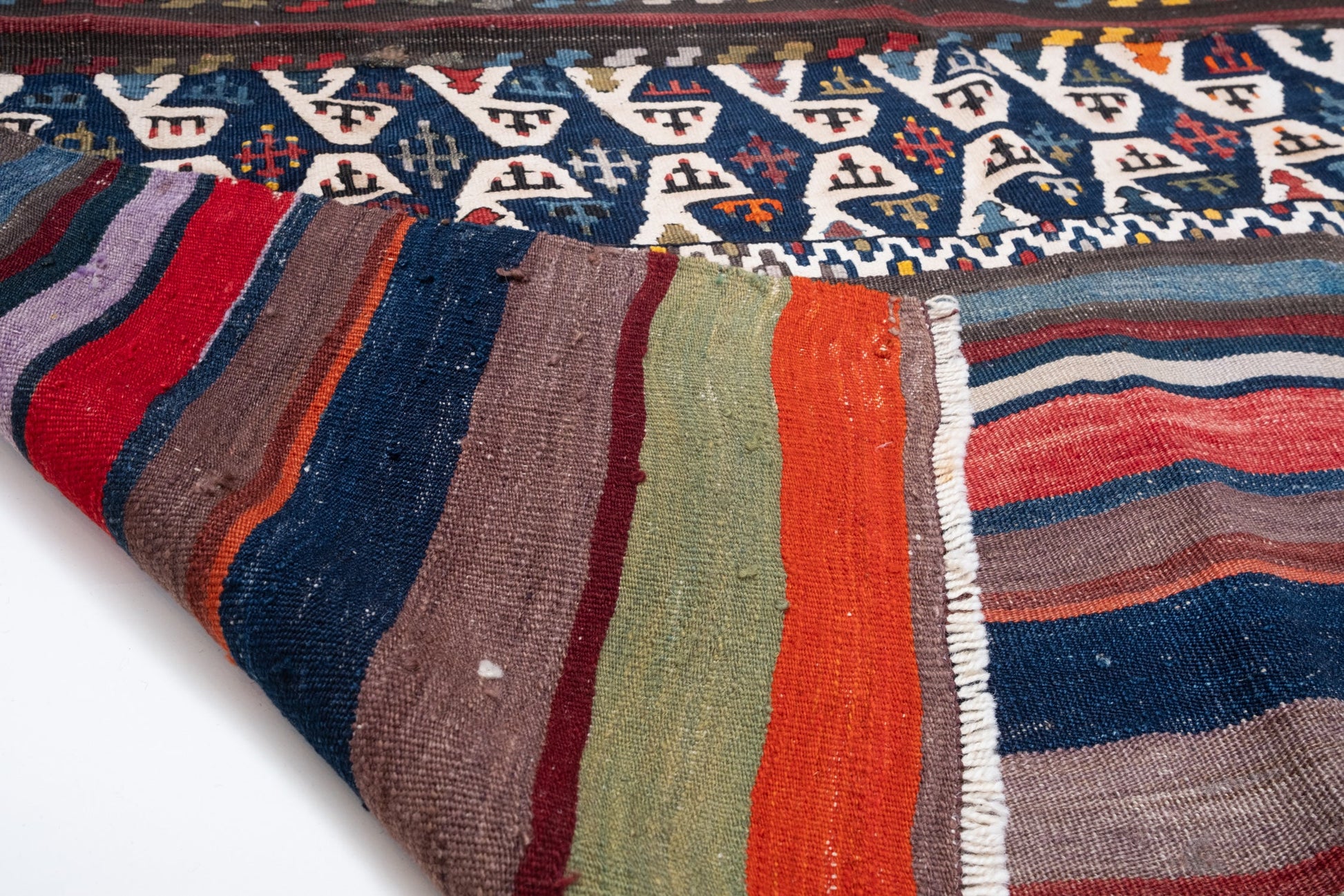 デザインと特徴: チュヴァル(袋)として使用されていた伝統的なキリムで、独特の幾何学模様と深みのある色彩が特徴です。赤や青を基調とした色使いが魅力的です。